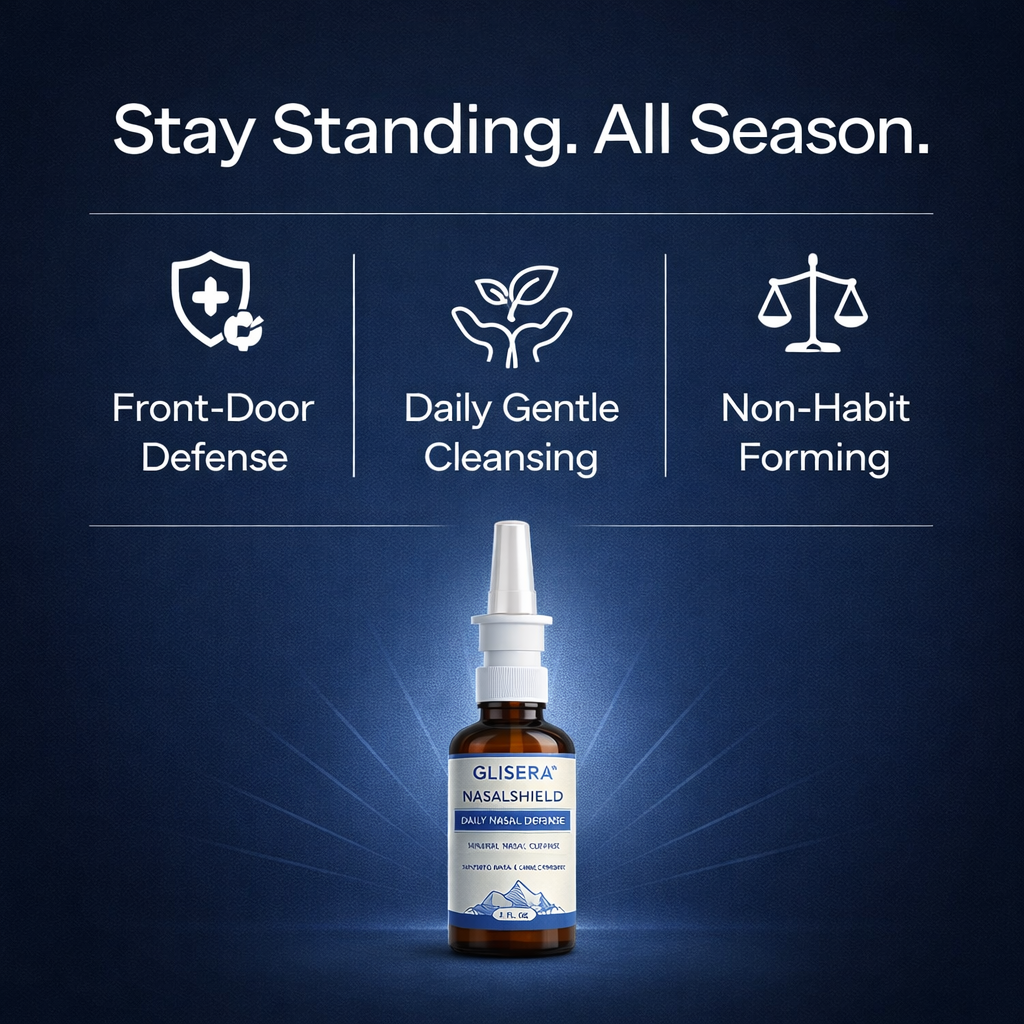 Glisera™ NasalShield is a daily iodine nasal spray formulated with Potassium Iodide and Fulvic Acid. It works at the nasal gateway — where 97% of respiratory viruses enter your body.